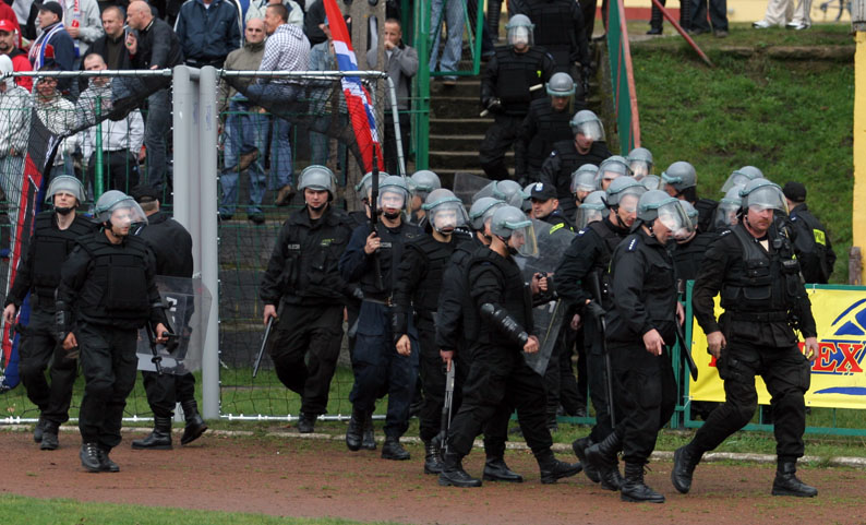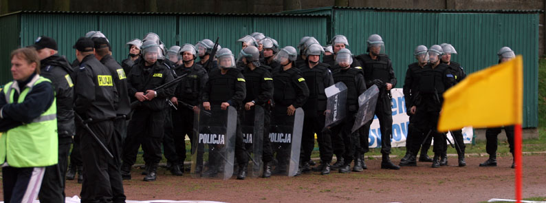Kurze Zeit später waren wir wieder am Stadion und wir teilten uns auf, Talijan blieb draußen und wartete auf die Gästefans die mit ca. 200 Mann anreisen sollten. Marco, Christian und ich gingen in den Ground. Pro Mann waren 5 Zloty fällig, sind ca. 1,33 Euro also ein recht guter Preis für einen Vollzahler. Langsam sickerte durch das heute keine Erlebnisorientierten Heimfans auftauchen würden. Ersten hatten sie wohl etwas bammel vor den Gästen und schoben deshalb einen Boykott gegen den Trainer vor. Schade Schade Schade! Langsam aber sicher sperrten die Bullen alles ab und hinter dem Stadion trafen die ersten beiden Busse ein. Die Fans wurden in den Gästekäfig äh Gästeblock meine ich geleitet. Es wurde die Zaunbeflagung angebracht. Die Hauptzaunfahne wurde dann nochmal ausgewechselt. Sahen aber beide gut aus. Die Gäste müssen sich ziemlich sicher gefühlt haben, da die Zaunfahnen außen also auf der ungeschützen Seite hingen. Zum Spielbegin wurden Kassenrollen geworfen, gefolgt von einigen Klatscheinlagen, Schalparaden und einem Bengalo. Untermalt wurde das ganze durch Gesänge und Gebrülle. Sehr schicke Fahne wurden auch geschwenkt. Ca. 35 Bullen bezogen ihren Posten neben dem Gästekäfig im Innenraum. Es traf noch ein Bus mit Gästefans ein und ein paar Freunde von Legia wurden auch begrüßt. Dann wurden Stoffbahnen und Stoffbalken im Block hochgehalten und einige Bengalen in den Nachmittagshimmel gestreckt. Es wurden die Fahnen noch einmal zum Einatz gebracht und Blinker gezündet. In Halbzeit Zwei wurde nur noch verbal supportet. Tore fielen auch erst die Führung für die Heimseite die sich dann auch mal kurz zur Wort meldete und gleich vollgepöbelt wurde. Dann wurde der Ausgleich erzielt und der Gästeblock voll am Ausrasten. Sehr schick. Zum Ende des Spiels traf der Hausherr noch zum 2:1 und das war dann auch das Endergebniss. Nach Spielende gingen wir zum Auto und fuhren gen Heimat. Auf dem Weg entdecken wir noch ein sehr schönes Legia Graffiti welches auch gleich abgelichet wurde. Irgendwann hatte uns Deutschland wieder und wir hatten zwei sehr schöne Tage in unserem Nachbarland verlebt. An dieser Stelle nach einen Dank an meine Mitreisenden, besonderen Dank an Talijan der wieder alles super organisiert hat. Bilder, gemacht aus dem Innenraum in Lodz werden auch wieder in einer Fotostory im Grenzgänger zu sehen sein. |