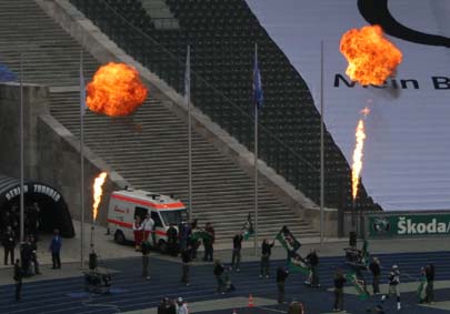 rausgehüpft und stellten sich schön im Spalier auf. Und siehe da Bengalos! Im Olympiastadion –